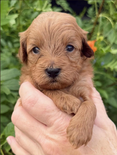 James is a Mini Goldendoodle with a beautiful apricot non-shedding coat.