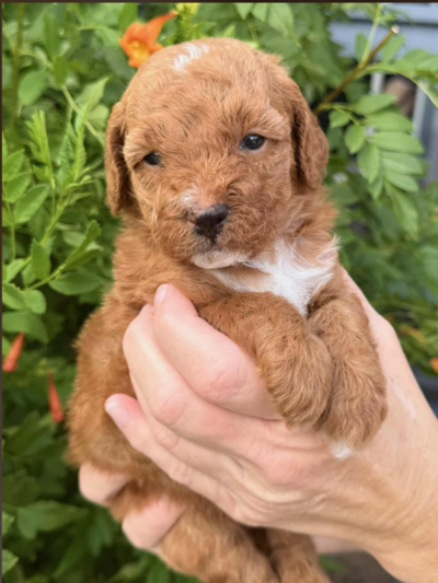 Matilda is a Mini Goldendoodle with a beautiful apricot non-shedding coat. I love her white marks on her chest and paws. She enjoys playing with her litter mates but also can sit back with a toy and watch her brothers roll around. Matilda is doing great with potty and crate training.